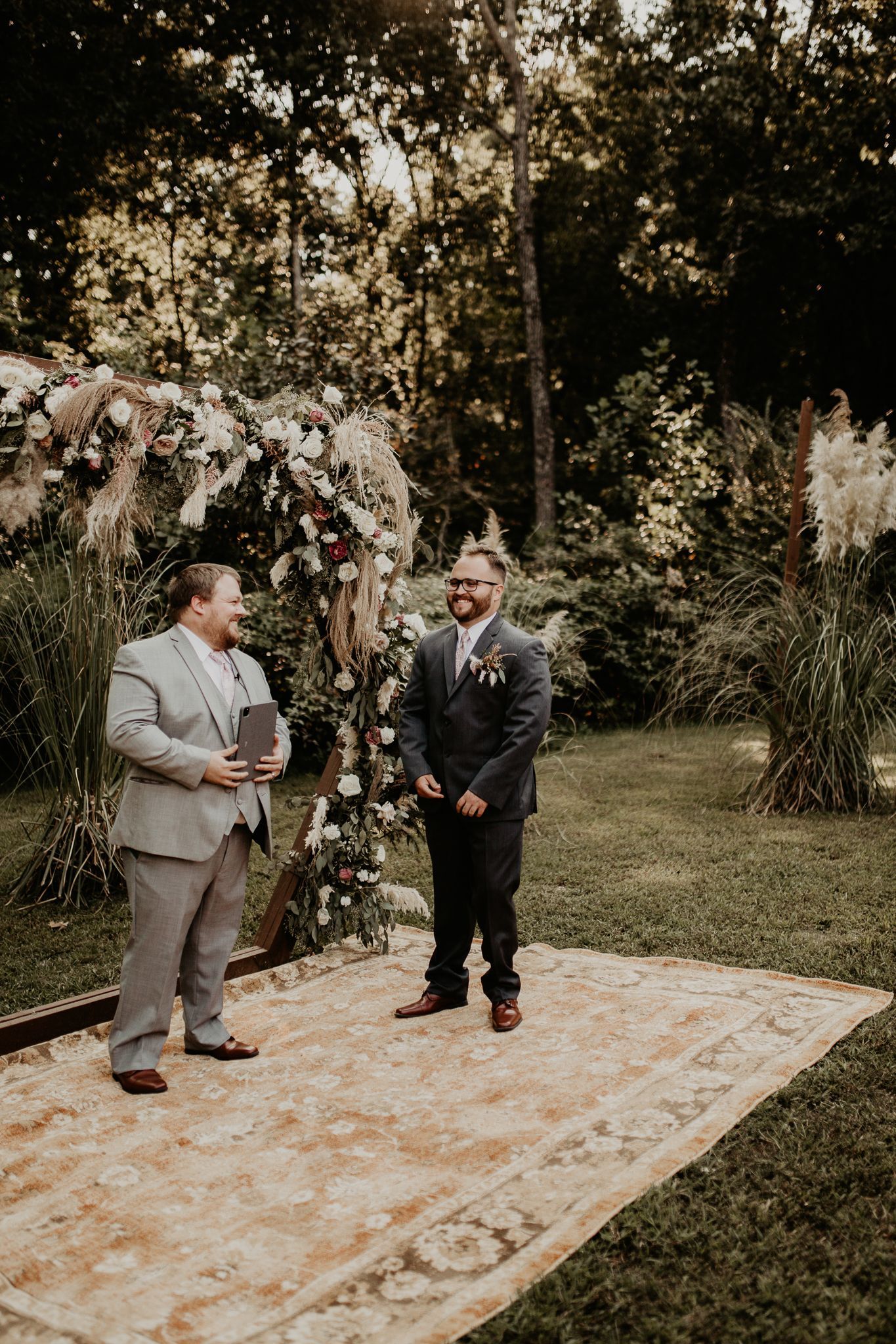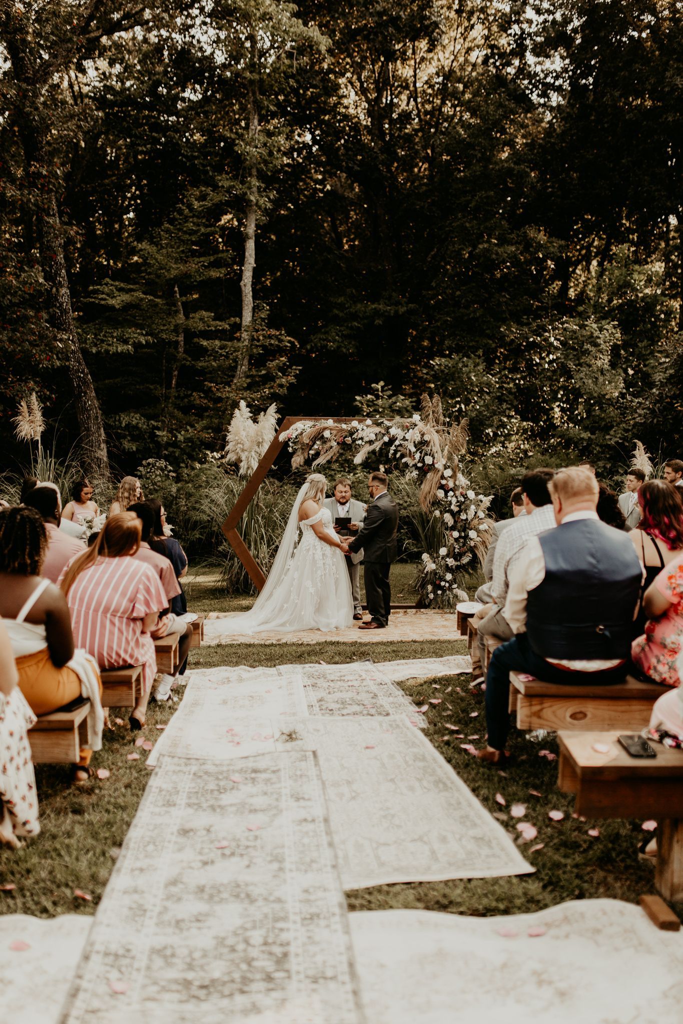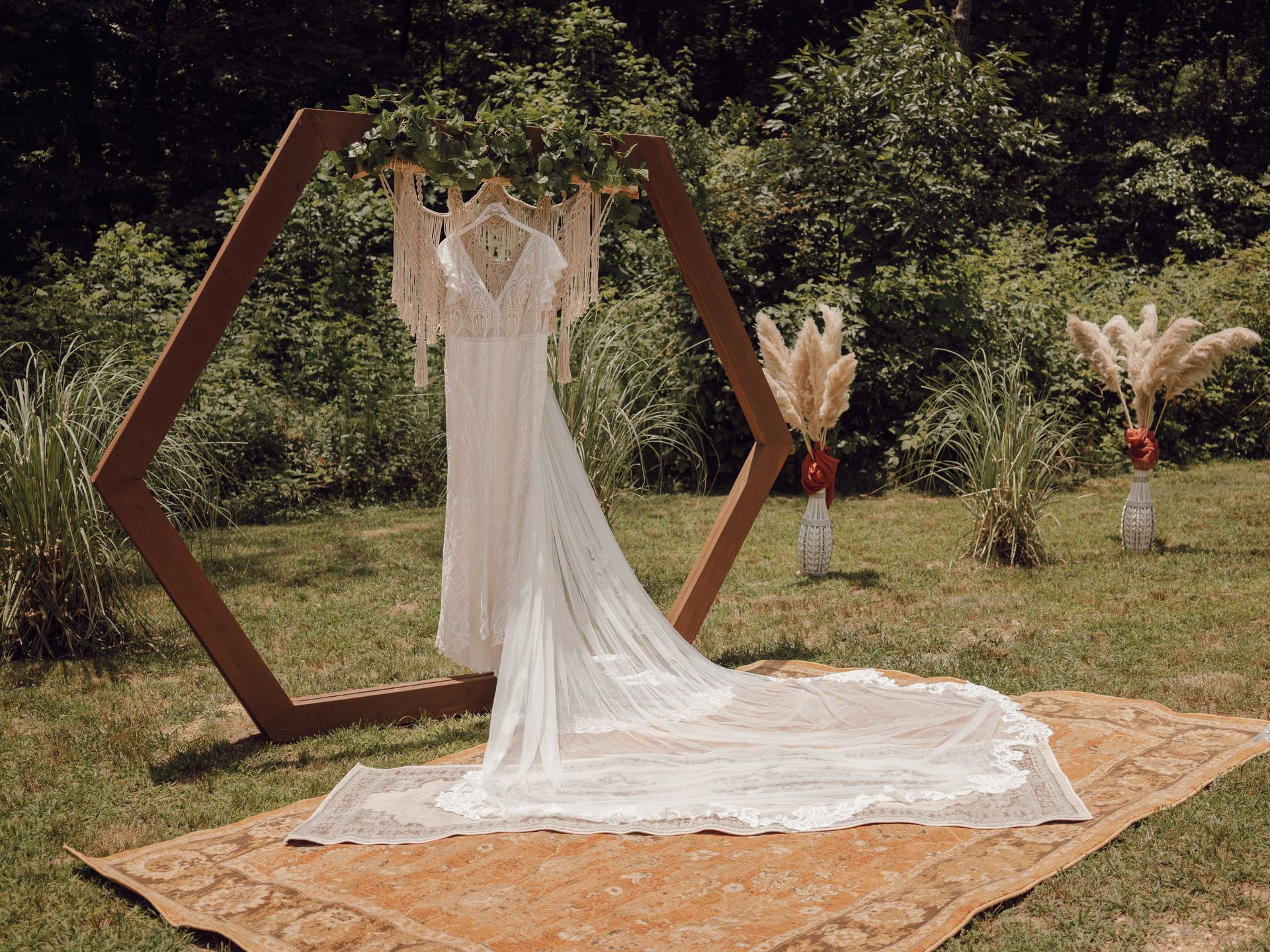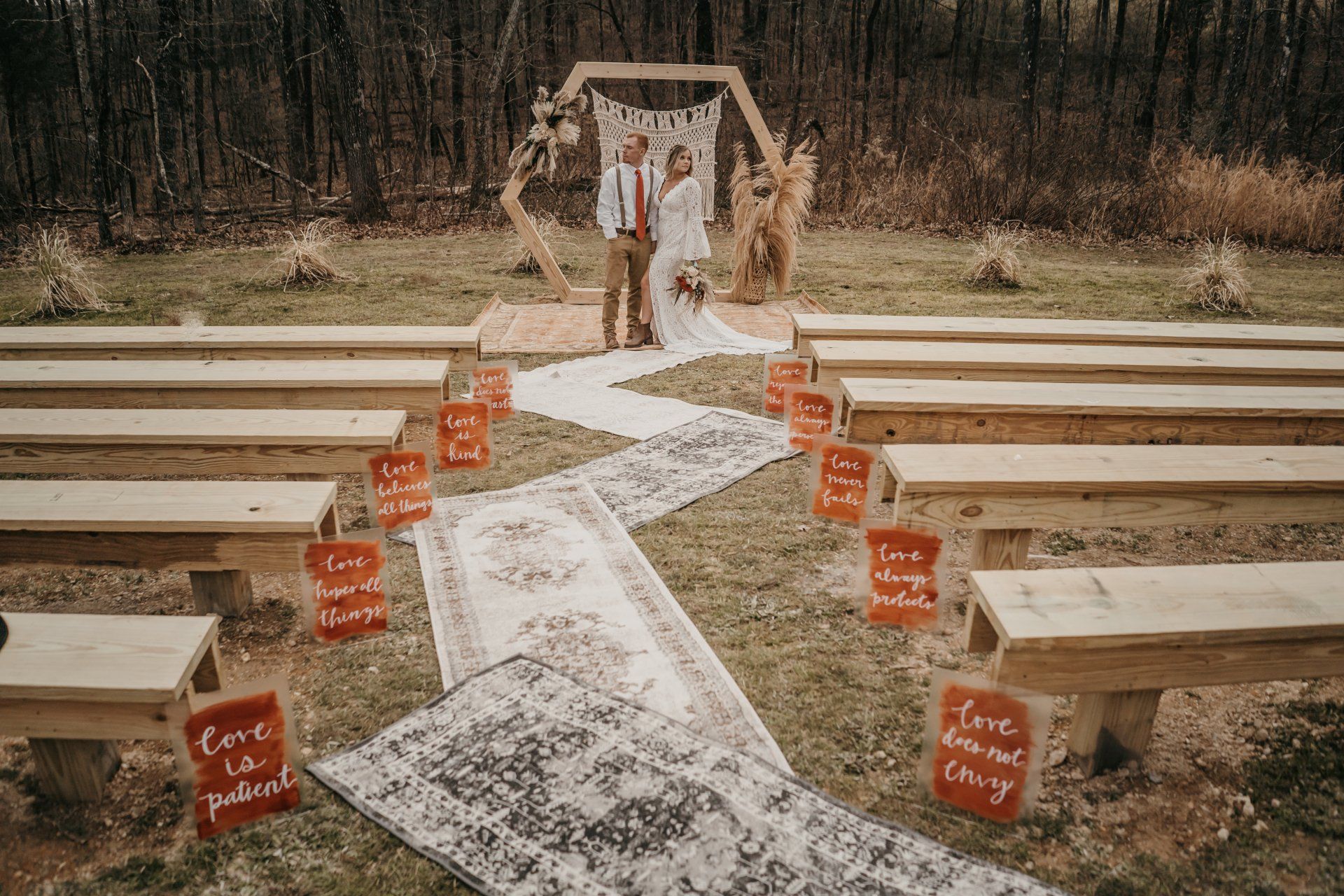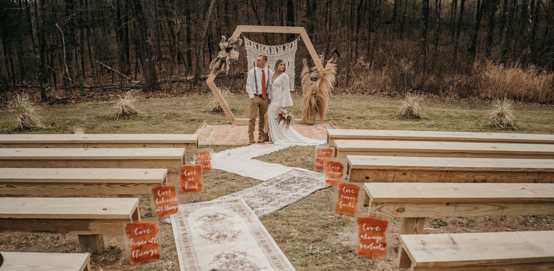 This site is located on the south lawn of the venue and is designed for those brides who want to combine a more relaxed and carefree outdoor atmosphere with their creative and free-spirited style. Guests and wedding party will walk through a set of free-standing doors with macramé hangings to get to this site with permanent bench seating. Various rugs are available allowing the wedding party to walk barefoot down the aisle to stand before a permanent arbor flanked on both sides by natural pampas grass.