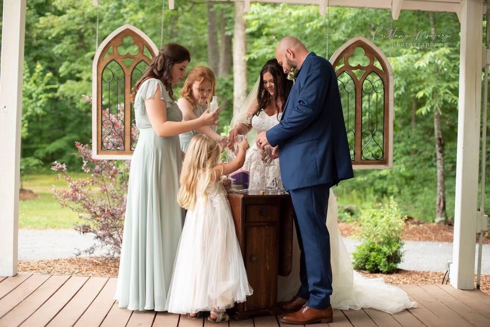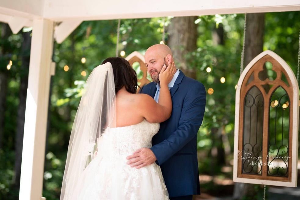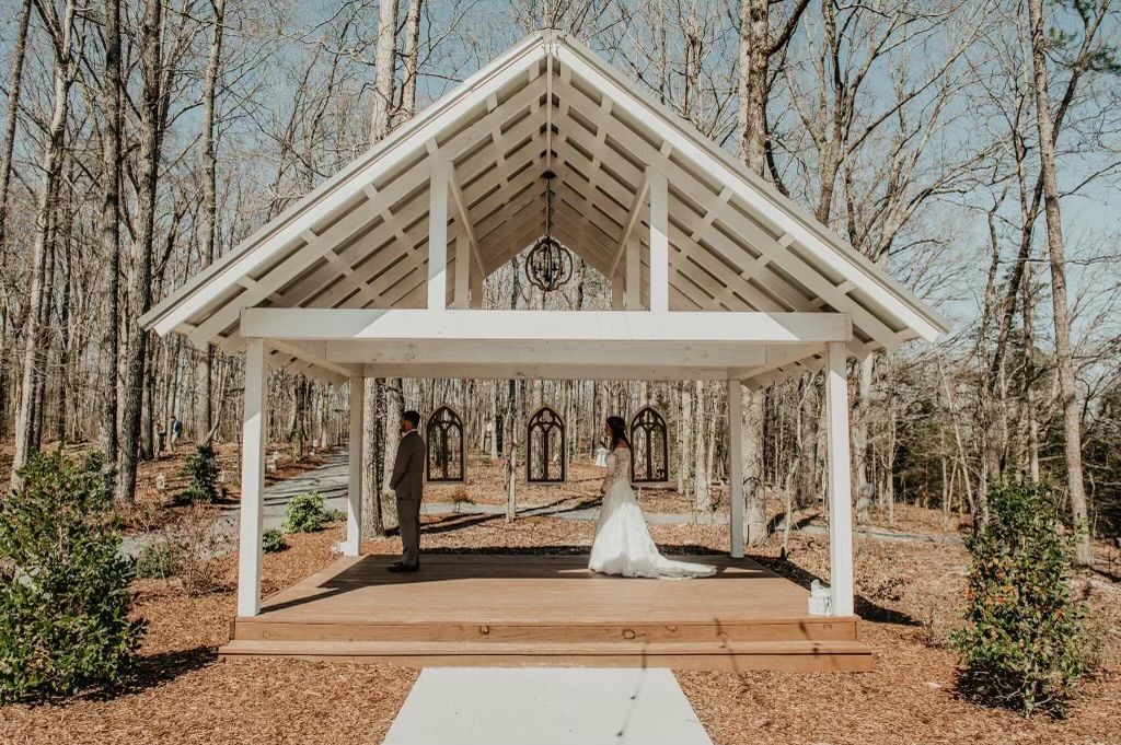 The open-air chapel site is to the north of the venue and allows for the entire wedding party to be clearly seen by their friends and loved ones. Decorative arch windows may be hung to give this area a traditional chapel feel creating a timeless charm with many trees serving as a beautiful natural backdrop. As guests are seated under strands of romantic lights, the chapel/stage and concrete patio area may be quickly transformed to a dance floor within minutes of the ceremony.
