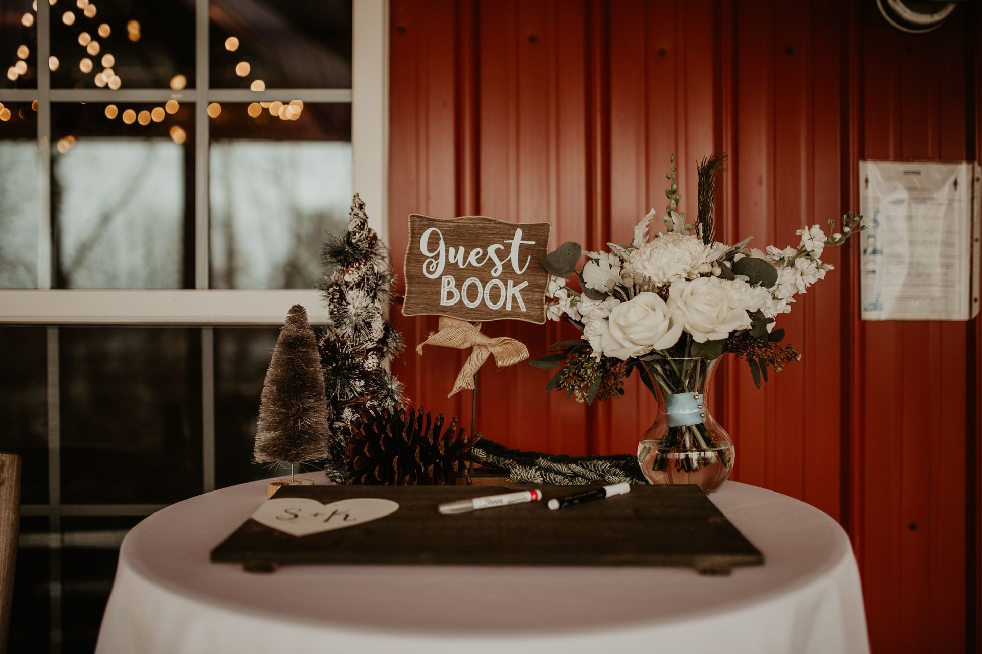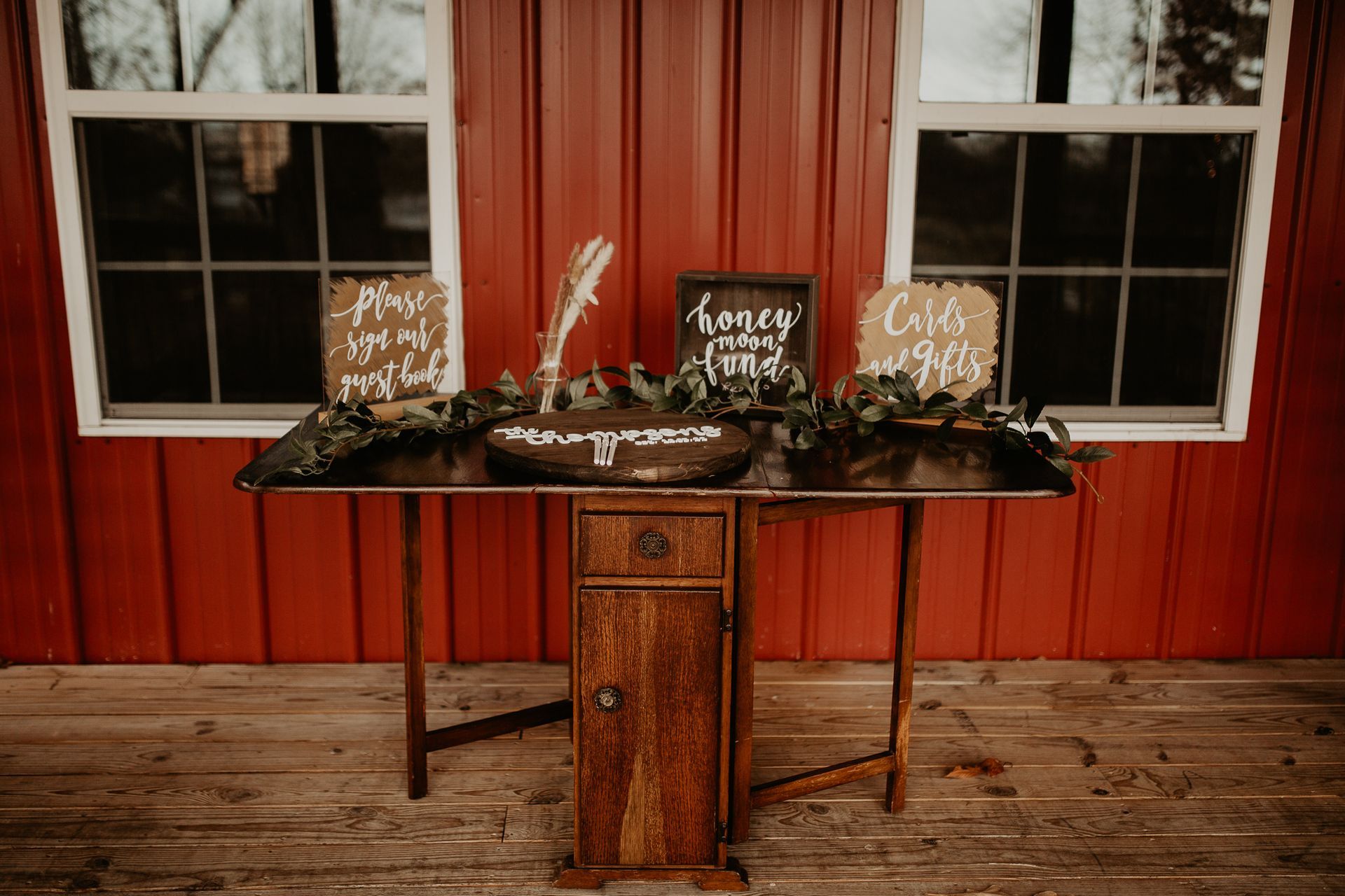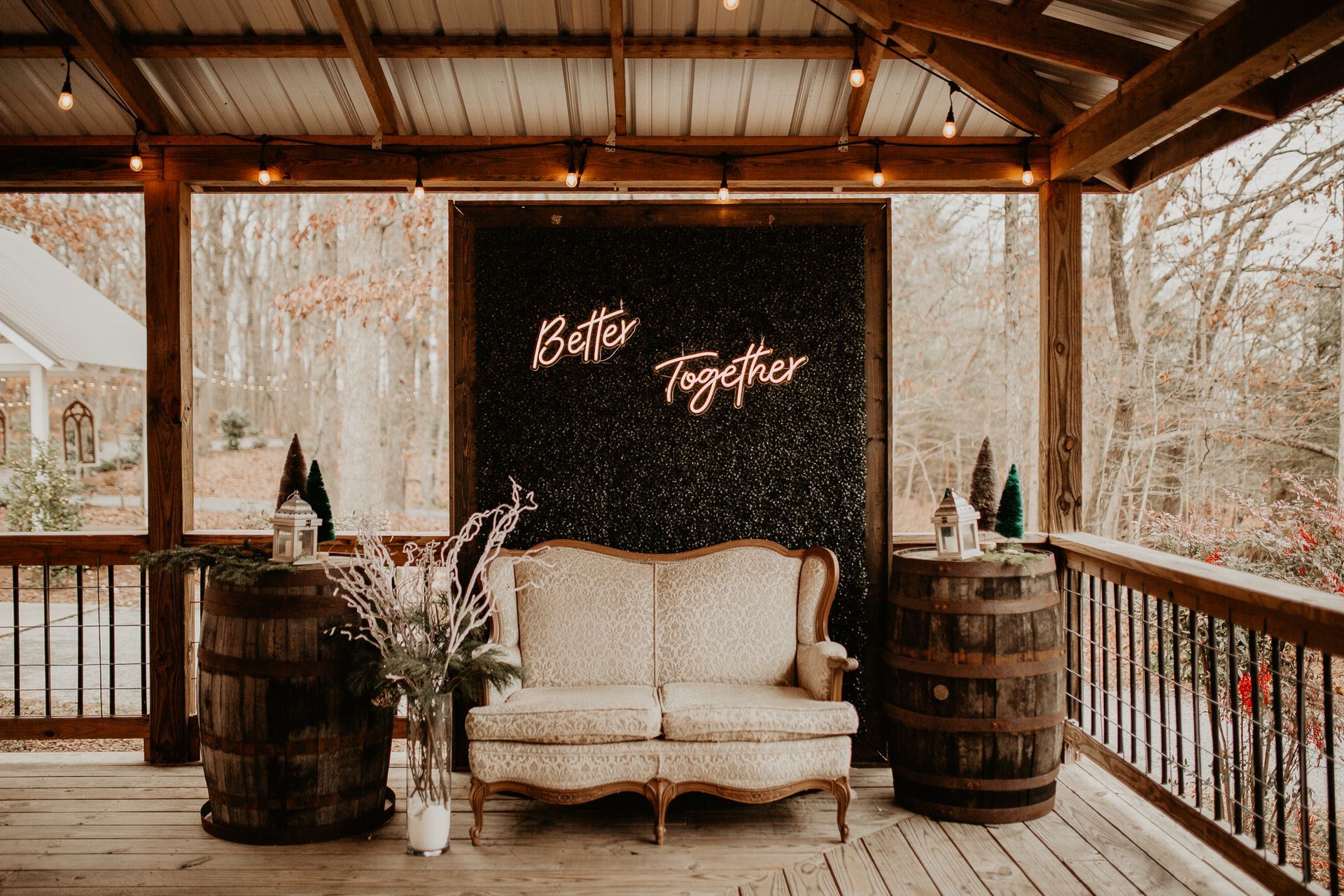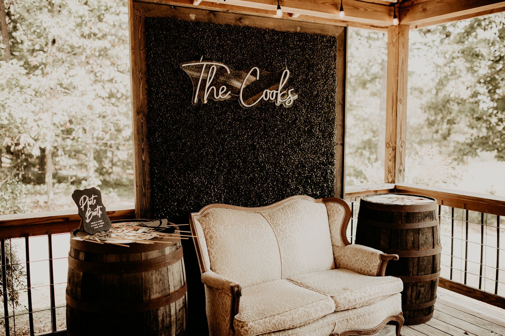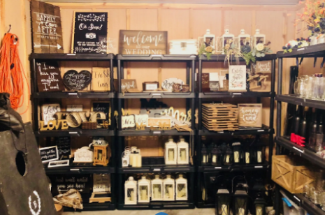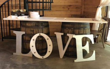 This room features labeled shelves filled with wedding décor items from lanterns and wooden signs to glass vases and runners which may all be used for no additional fee. Along with the decorations are the facility’s cornhole boards and an antique loveseat that may be taken and used anywhere on the property for picture purposes. We simply ask that items removed and used for the wedding are returned at the end of the evening.
